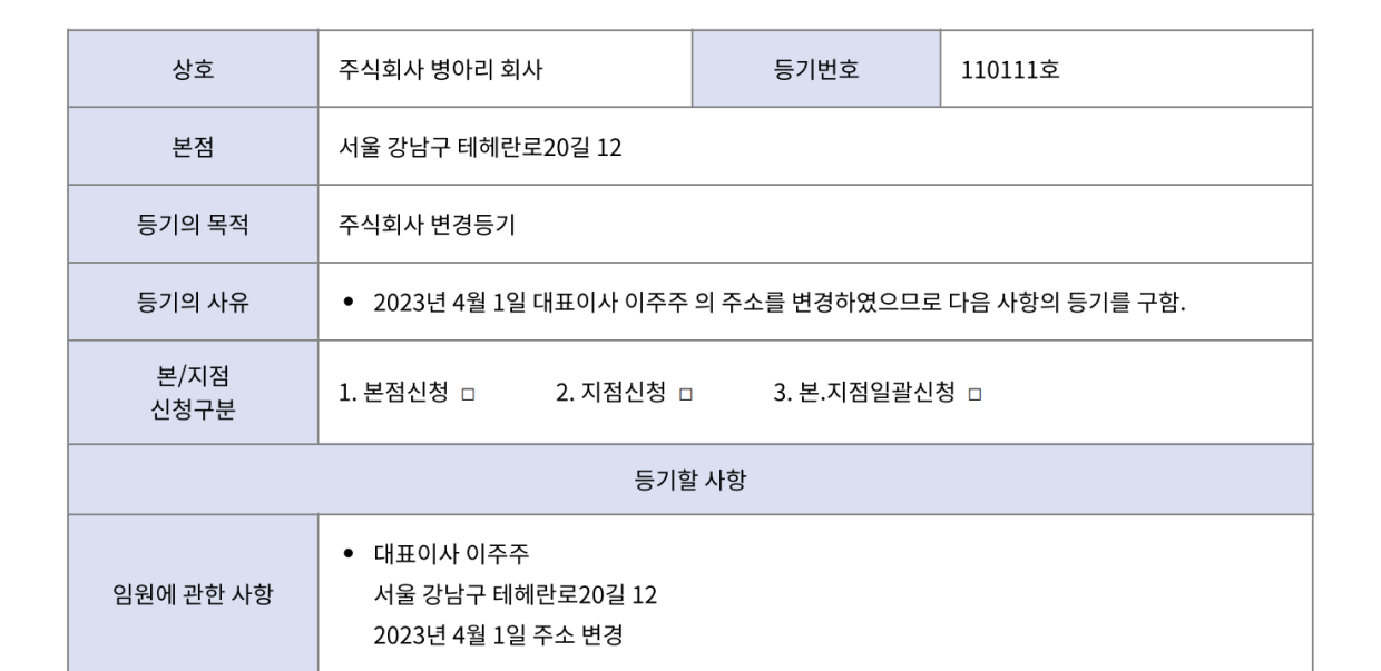 - 등기의사유: 2000년 0월 0일 대표이사 OOO(성명)의 주소가 변경되어 다음 사항의 등기를 구함