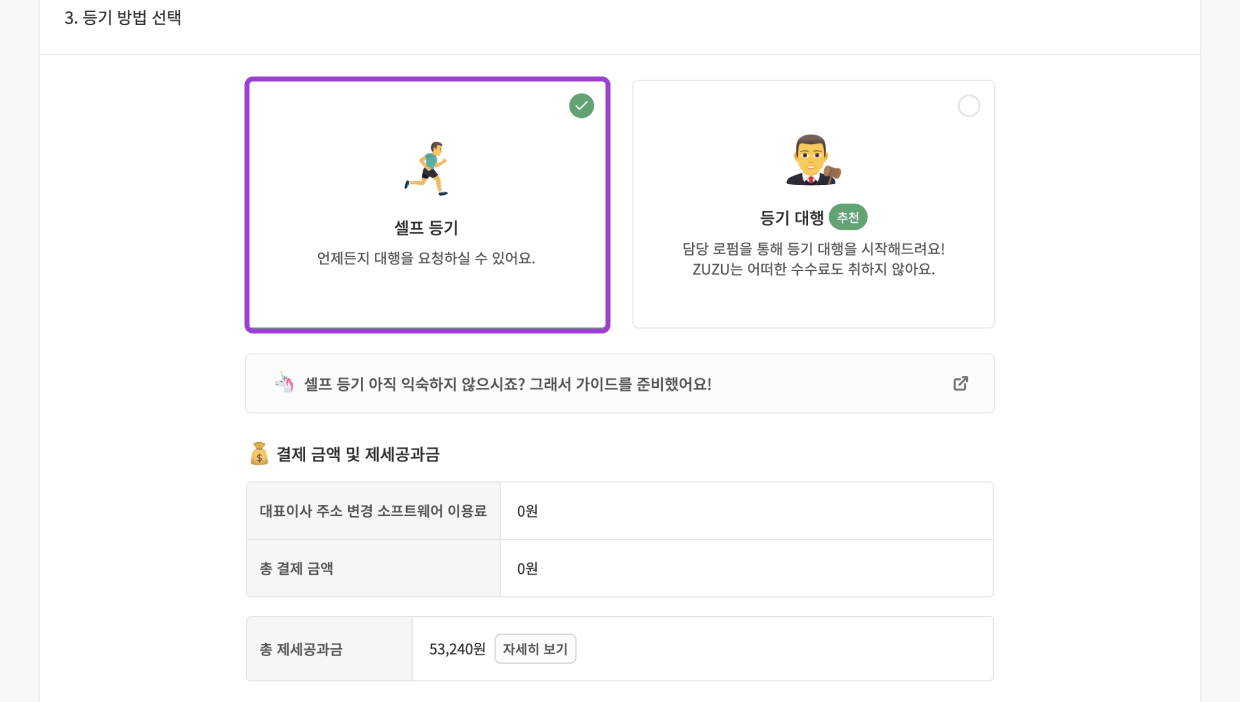- 등기 대행을 선택했다면 대행료를 결제해 주세요.