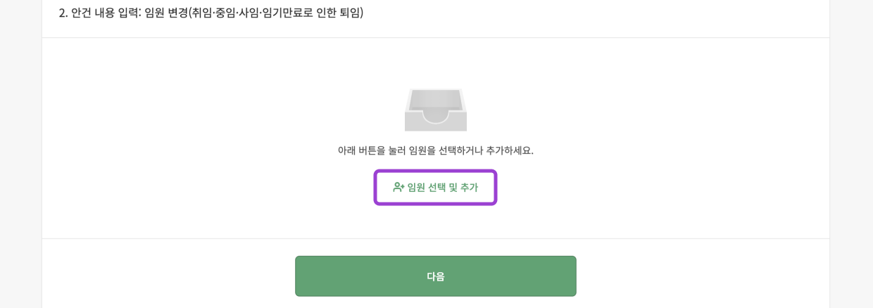 1-3. ‘임원 선택 및 추가’를 눌러, 취임해야 할 임원을 선택한 뒤 세부 정보를 입력해주세요.