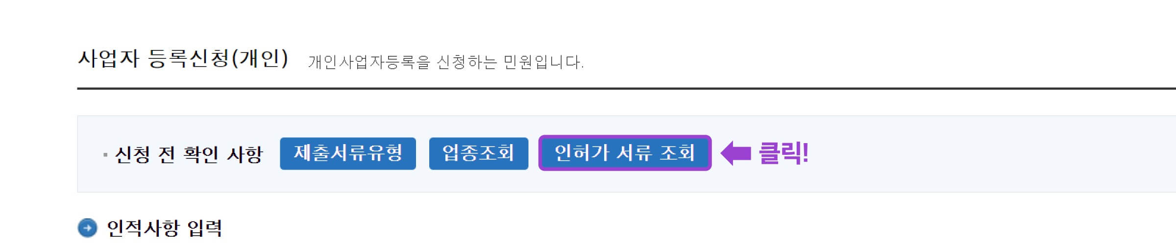 3. 페이지 상단의 신청 전 확인 사항 내 ‘인허가 서류 조회’ 클릭