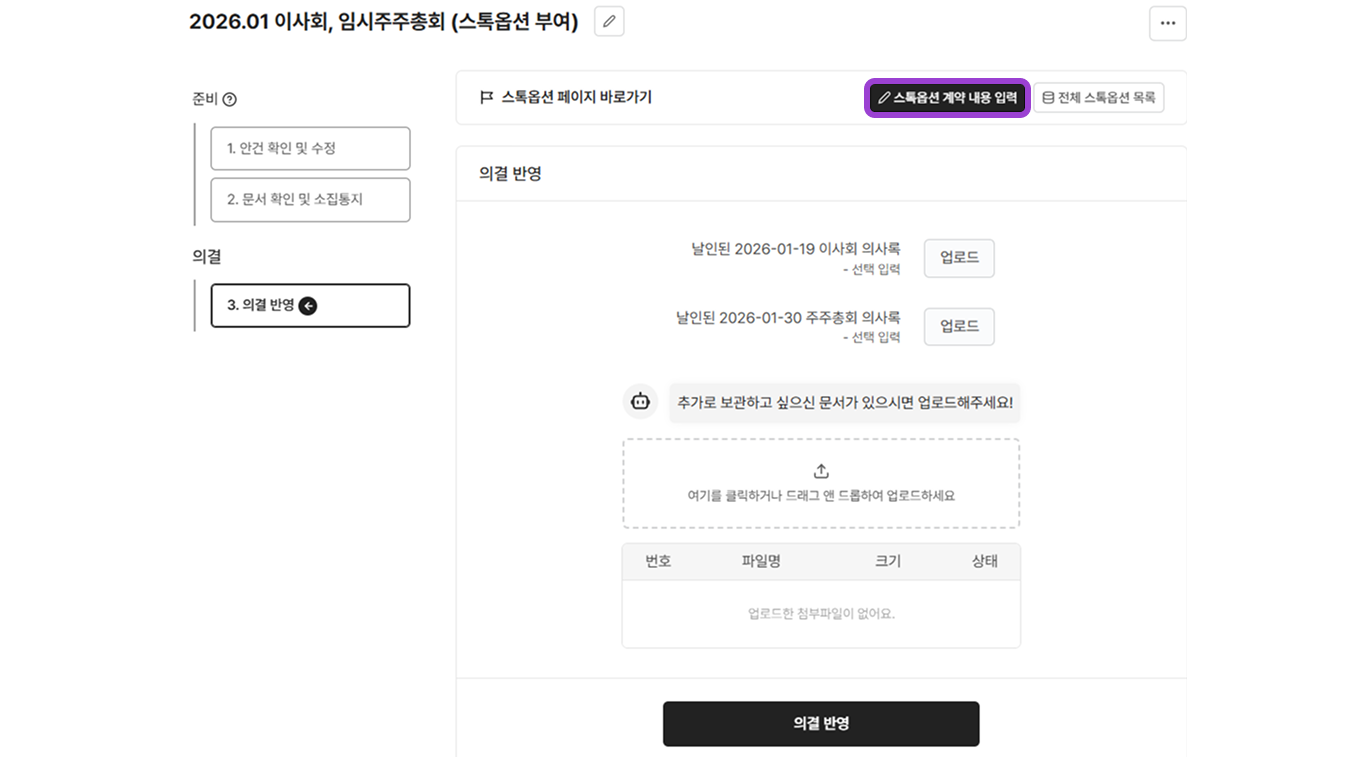 1-1. 스톡옵션 부여 안건의 ‘의결 반영’ 단계에서 ‘스톡옵션 계약 내용 입력’ 버튼을 누르세요.