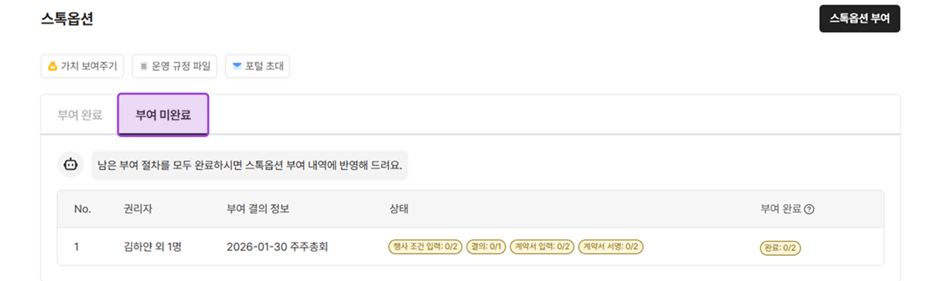 1-2. 스톡옵션 ‘부여 미완료’ 탭에서 계약서 작성이 필요한 스톡옵션 내역을 볼 수 있어요. 클릭하면 부여 상세 페이지로 이동해요.