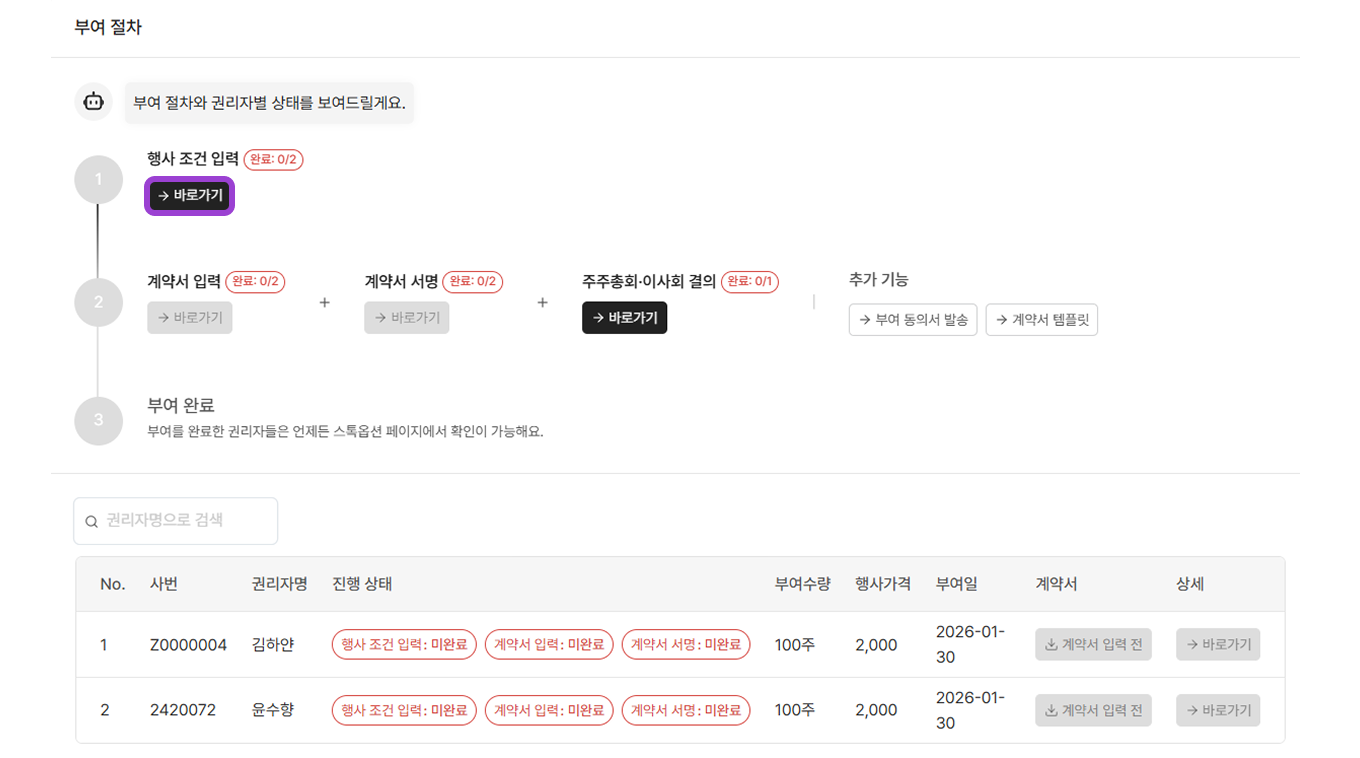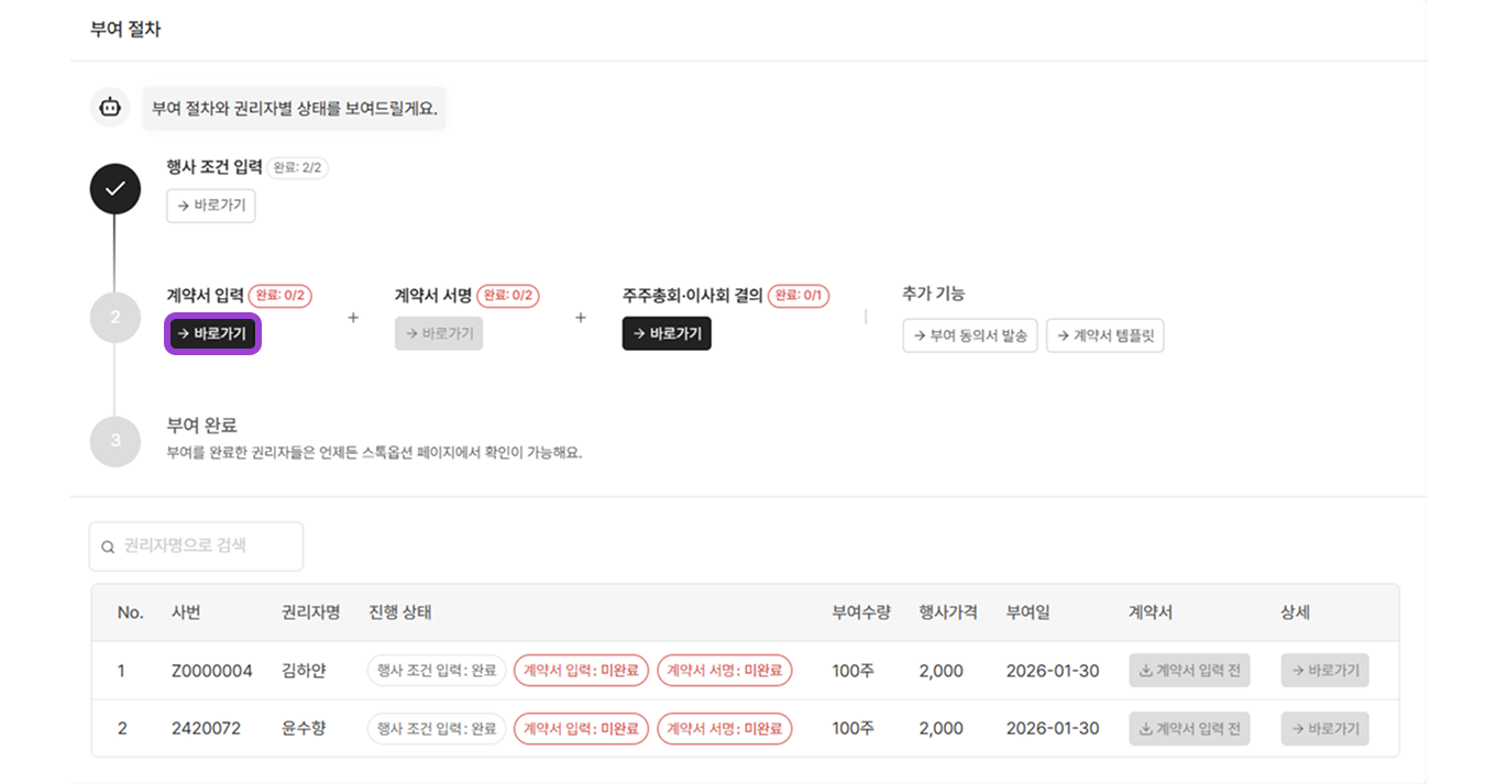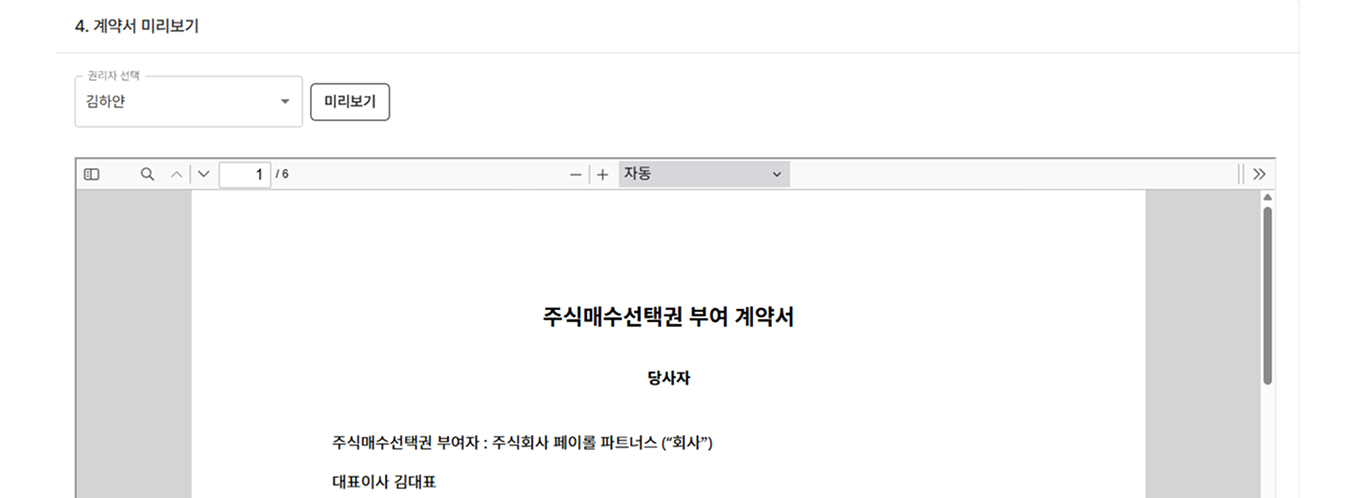 이 단계에서 입력한 스톡옵션 베스팅은 계약서에 자동으로 포함되고, 계약서 서명 완료 후에 ZUZU 스톡옵션 명부에도 등록돼요.