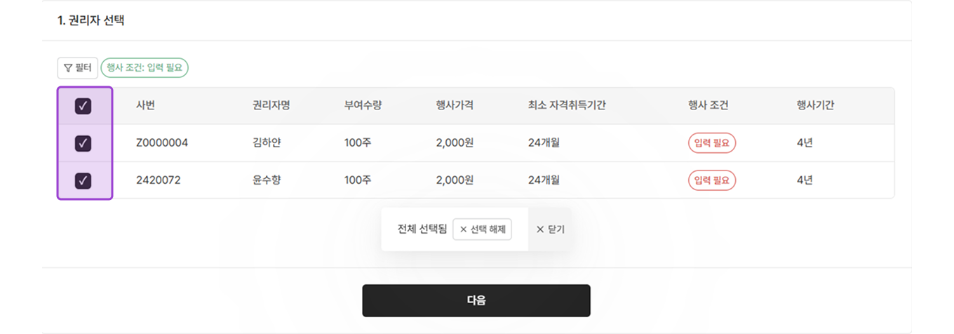 1-4. 행사 조건을 입력해야할 권리자를 선택하세요. 여러 명에게 똑같은 조건으로 부여한다면 한번에 입력할 수도 있어요.
