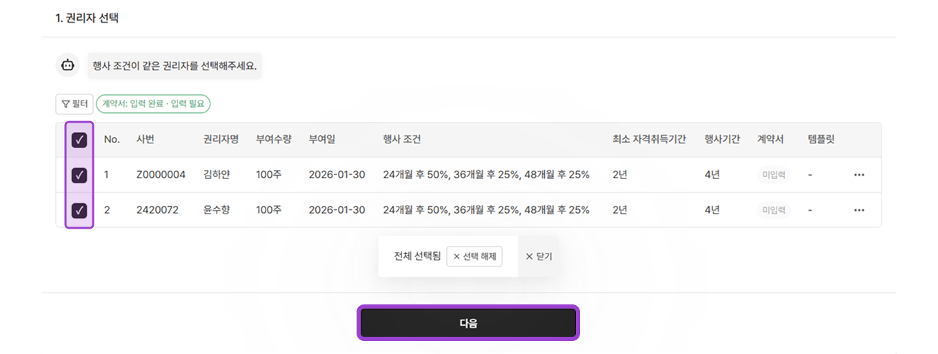 3-2. 동일한 계약서 템플릿을 적용할 권리자를 모두 선택하고 ‘다음’을 누르세요.