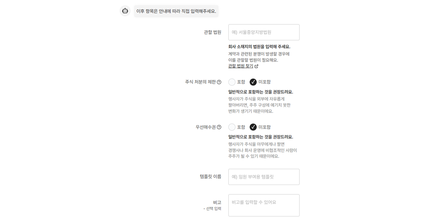 이제 스톡옵션 계약서 세부 조항을 입력할 차례에요.