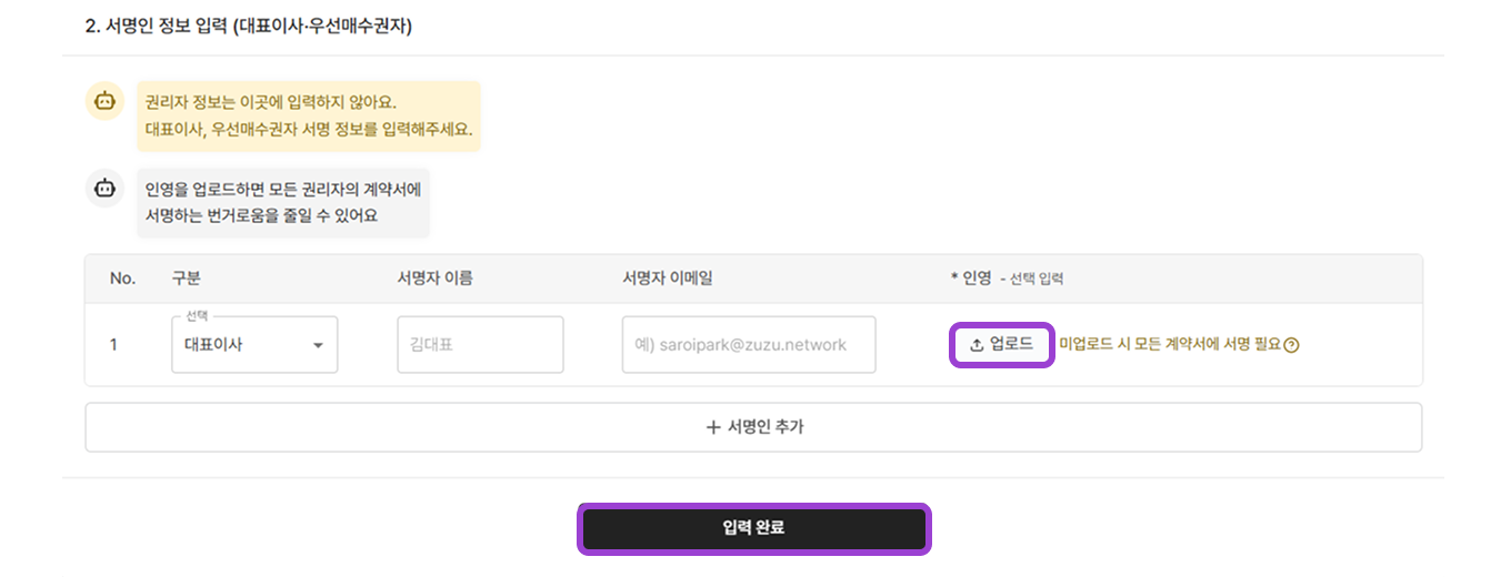 3-7. 전자서명 정보 입력이 완료되었다면 ‘입력 완료’를 누르세요. 계약서 템플릿이 완성되고, 권리자를 선택하는 단계로 돌아가요.