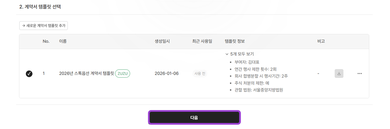 3-3. 이제 계약서 템플릿을 선택할 차례예요. ZUZU에서 처음 스톡옵션을 부여하신다면 ‘새로운 계약서 템플릿 추가’를 눌러주세요.
