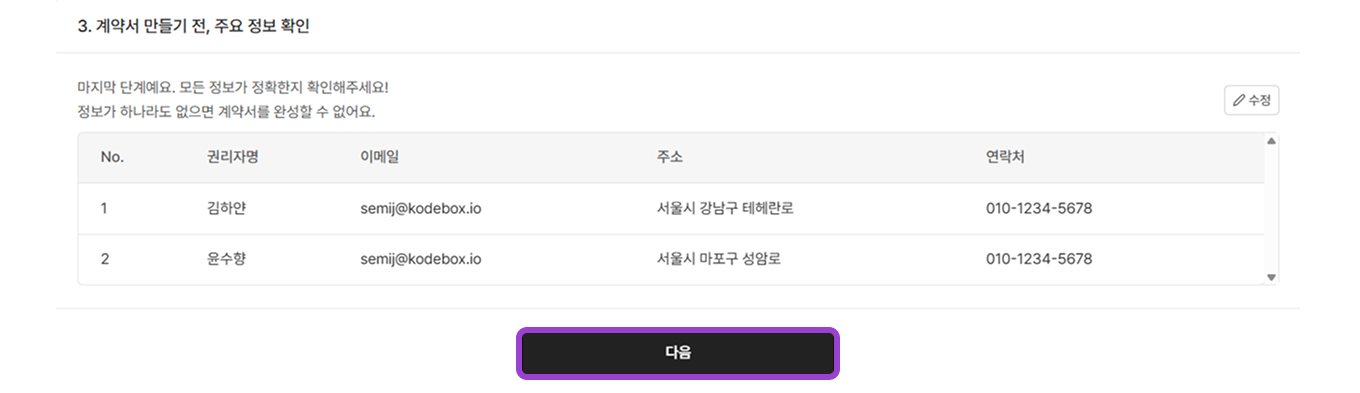 3-9. 새로 만든 계약서 템플릿을 선택하고 ‘다음’을 누르세요. 권리자의 주요 정보가 잘 들어가 있는지 확인하세요. 모든 확인이 끝나면 ‘다음’을 누르세요.