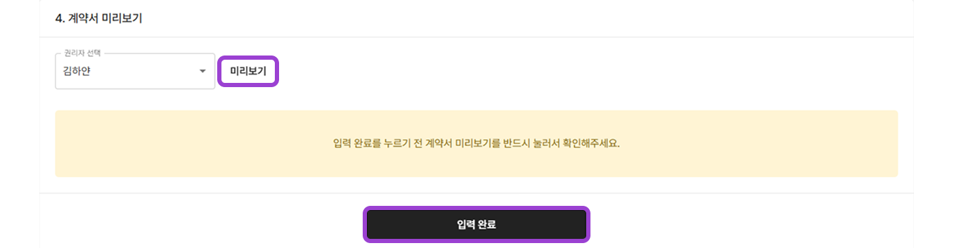 3-10. ‘미리보기’ 버튼을 눌러 계약서 내용을 확인하고, ‘입력 완료’를 누르면 계약서 작성이 끝나요.