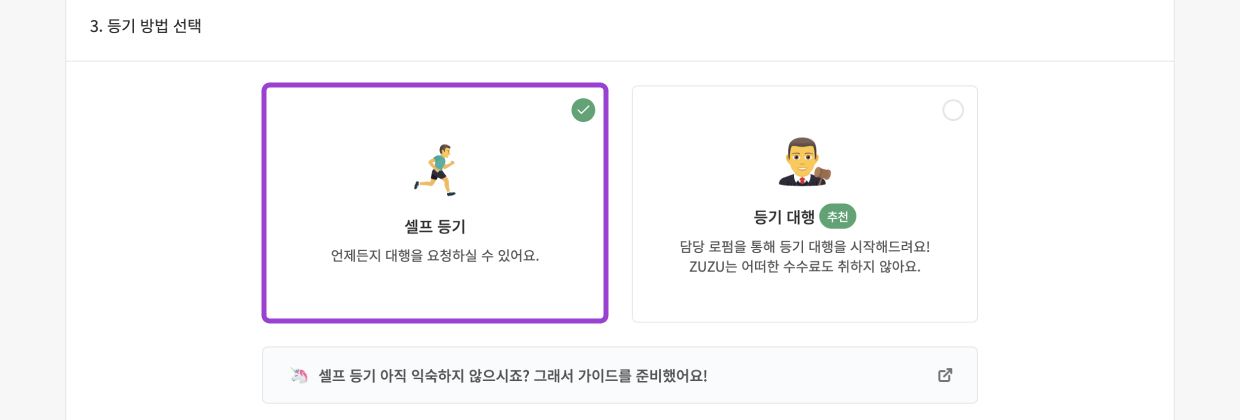 1-6. 일정을 모두 입력하고 ‘다음’을 누르면 등기 방법을 고르실 수 있어요. ‘셀프 등기’를 선택하고 결제를 진행해주세요. 결제가 완료되면 ‘모든 문서 확인’ 페이지로 넘어가요. ZUZU를 통해 간편하게 생성하신 등기 문서들을 확인해주세요!