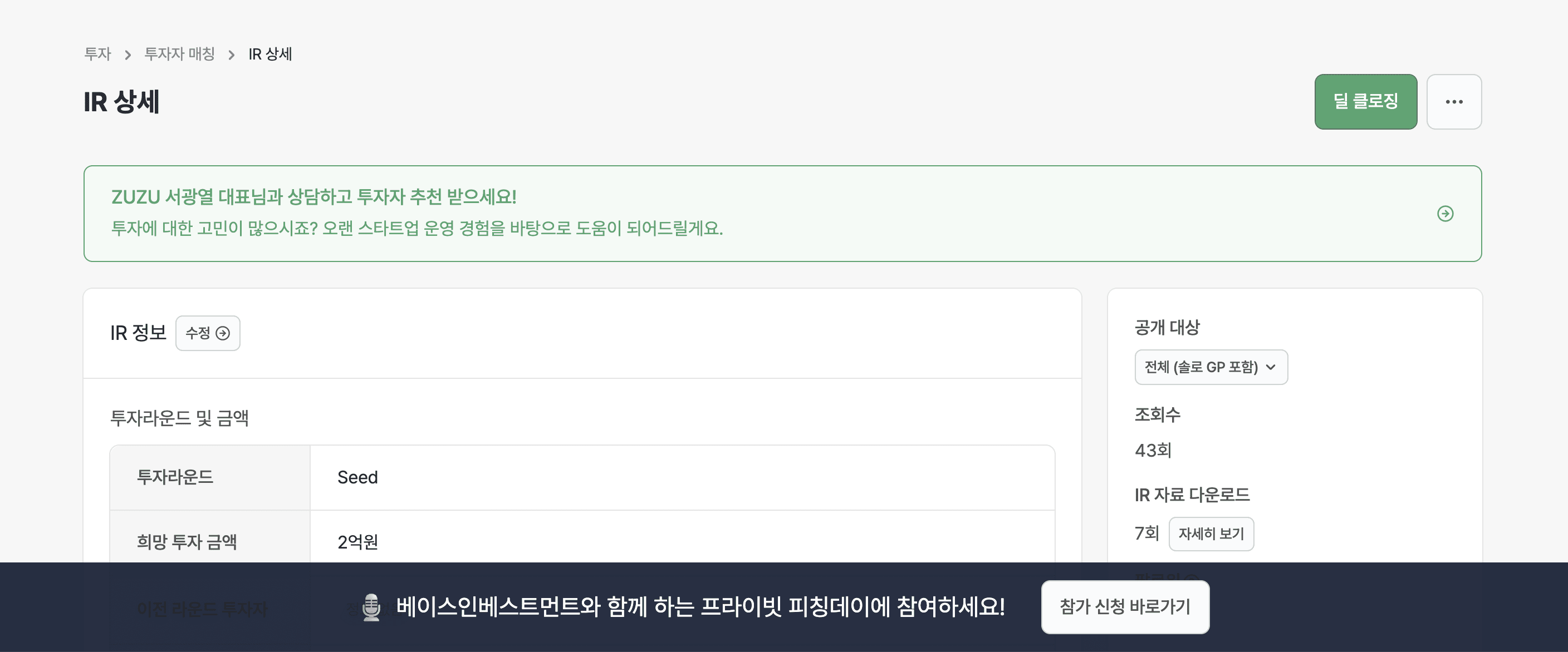 베이스인베스트먼트 심사역에게 기업을 소개하고 질의응답 및 네트워킹하는 시간 마련